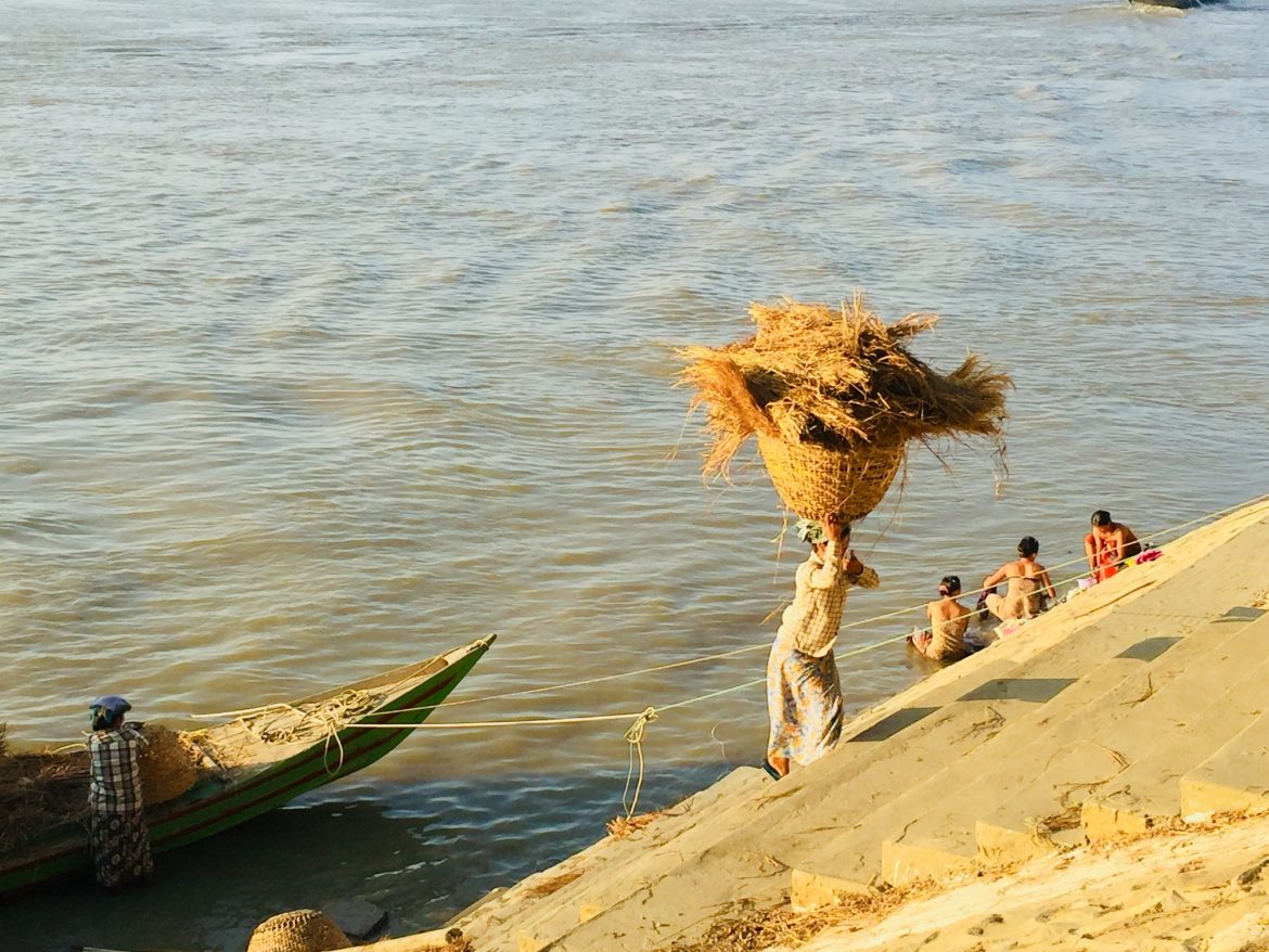 Weiterfahrt entlang des Irrawaddy River. Die gesamte Fahrt ist sehr entspannt, vorbei an zahlreichen goldenen und nicht goldenen Pagoden, kleinen Dörfern und freundlich zuwinkenden Menschen. man kann beobachten, wie sich das Leben hier am Fluss abspielt. Ich besuche u.a. ein kleines Dorf, welches bekannt ist für die Produktion von Steingefäßen.